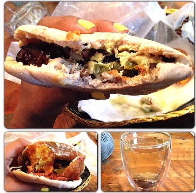 This pic is the awesome sandwich I ordered and demolished in minutes! The Sabich Sandwich featured here is on whole wheat pita bread stuffed with fried eggplant, hard boiled egg, hummus, Israeli salad, tahini, pickles, and fluffy potato chips! This melted in my mouth! I’m a huge eggplant lover so this worked well for me and will for my fellow vegetarians. I had to finish my meal off with jasmine tea. They have all types of Teas too!
