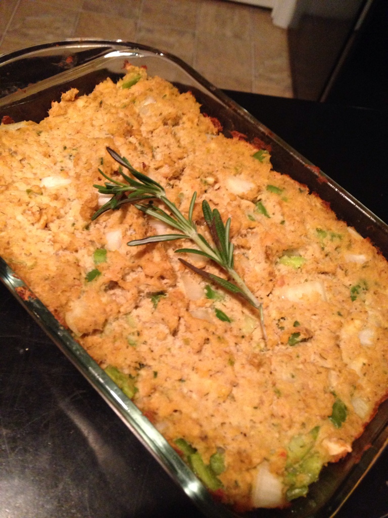 3. Preheat oven to 350. Spread mixture in baking dish and bake for 40 minutes or until golden brown at the top. Garnish with rosemary.