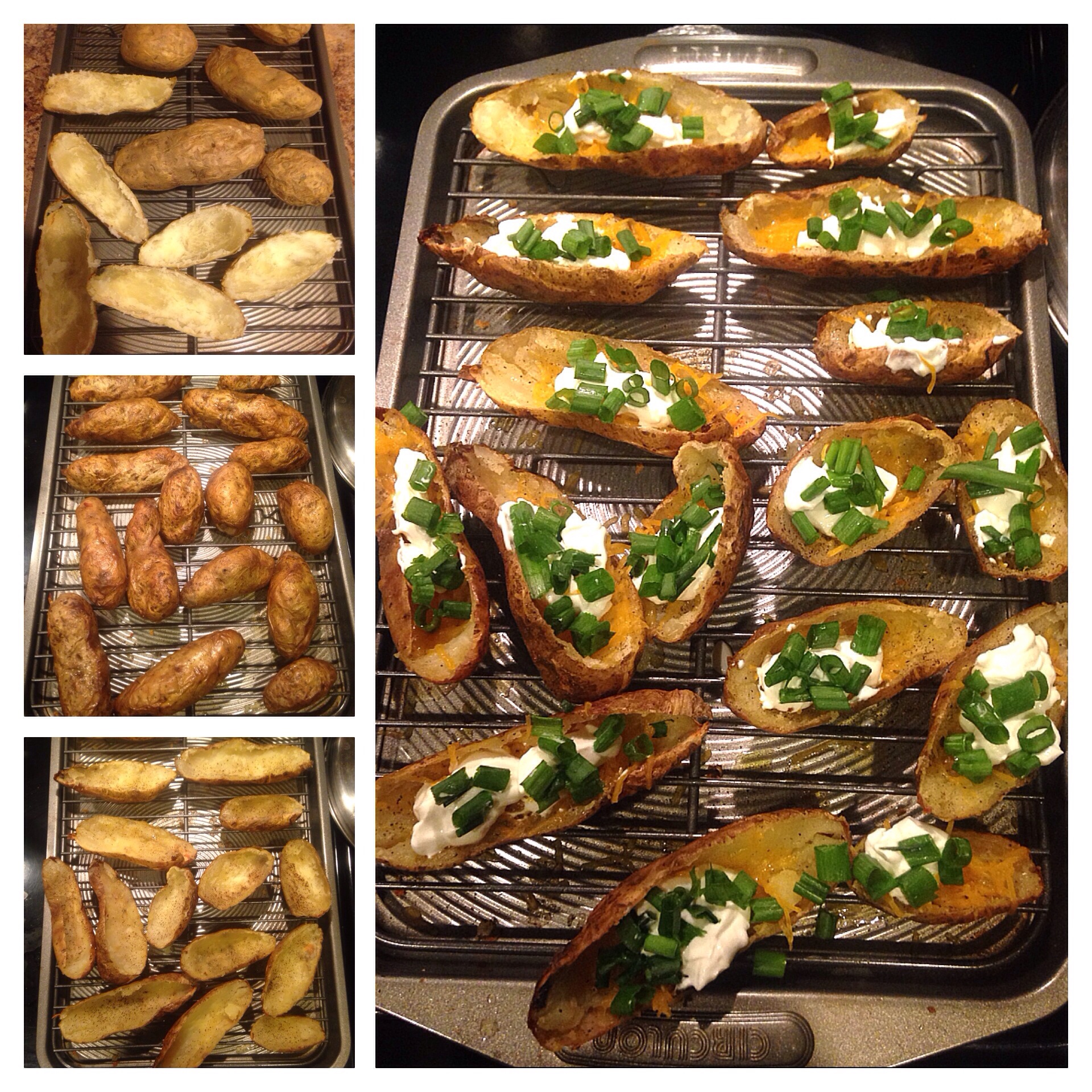Soooo I had this 5lb of russet potatoes in my kitchen that were really all oddly shaped and weren’t going to make much of a baked potato. Sooo I decided to take a try at potato skins! It was quick and easy! Of course I left the bacon out but it was just as good!
