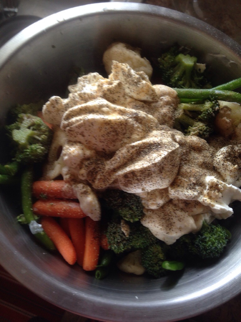 1 bag of vegetable medley (cauliflower. Carrots, broccoli, snap peas, etc.) fresh or frozen