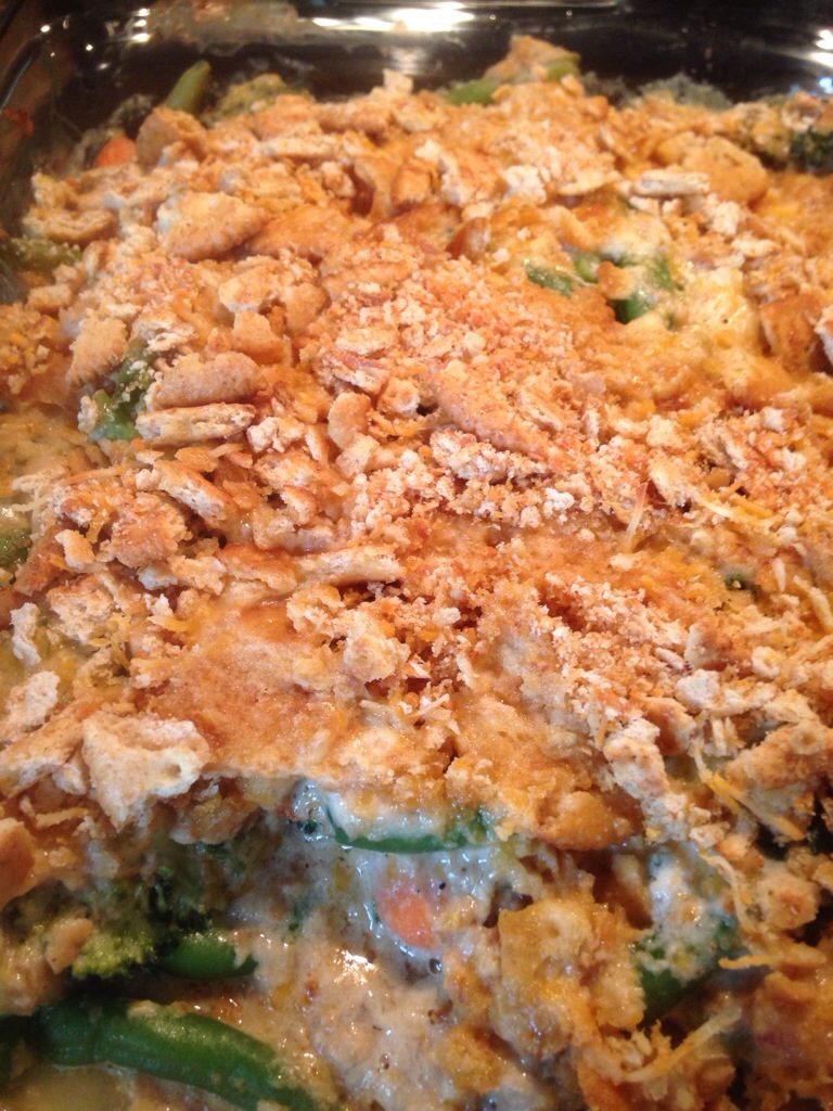 3. Spread vegetable mixture into casserole dish. Crush crackers and mix with additional cheese. Add as top layer to vegetable mixture. Pour melted butter evenly on top.