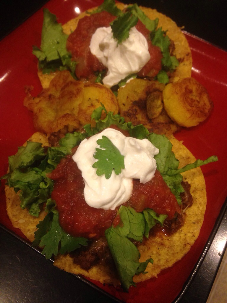 Anyhoo, tonight I made Boca Tostados. I said let me switch taco night up by using the flat Tostados as oppose to soft or hard shells. Pictures say it all, but I simply cooked the crumbles as instructed then added water and taco seasoning mix. I topped the Tostados with the boca crumbles and cheese and baked at 350 until cheese was melted. I topped each with cilantro and green leaf lettuce (I realized next time I just can use cilantro and no lettuce at all), salsa, and sour cream. I made plantains on the side as I think they work with everything. Unfortunately my avocados weren’t ripe but I def stress the importance of avocado at any taco night — how can you not have it?