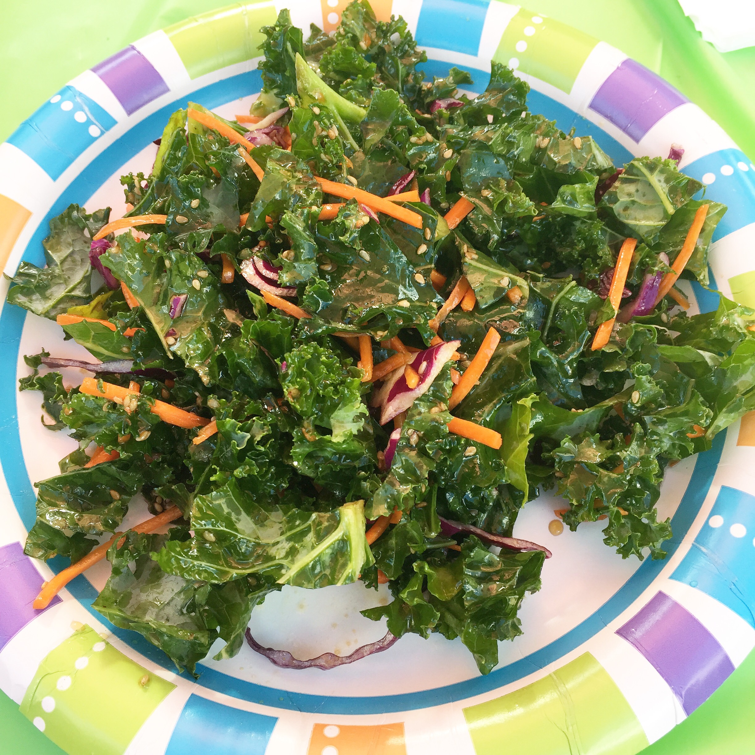 As you can see this simple kale salad below just included kale, sesame seeds, red cabbage, and shredded carrots. The kale dressing is simple as well… Olive oil, sesame oil, rice vinegar (sweet), brown sugar, and salt & pepper.