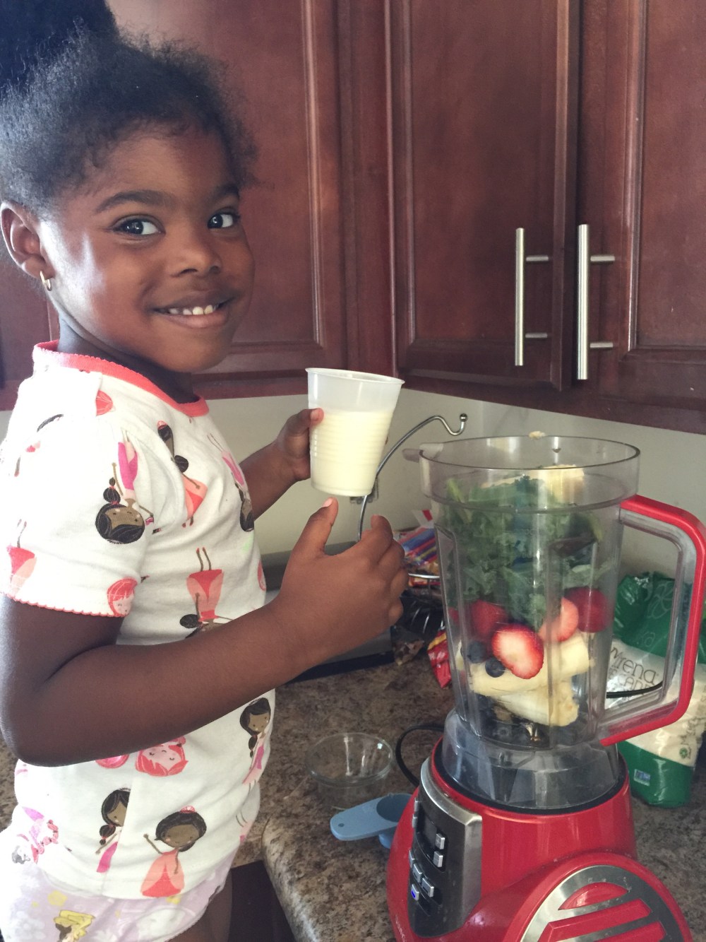 Just as with Spinach, my family and I add Kale to a good ol Smoothie packed with banana, blueberry, strawberry, organic milk or almond milk, and honey. Quick easy and Kids still love it!