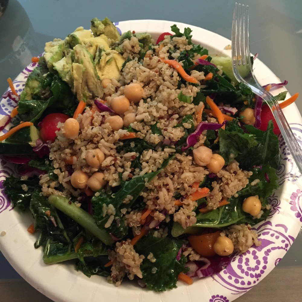 Here is a loaded Kale salad that I just love!!! Toss together Kale, red cabbage, shredded carrots, cucumber, heirloom tomatoes, quinoa & brown rice, and chickpeas. Add simple dressing combo mentioned above.