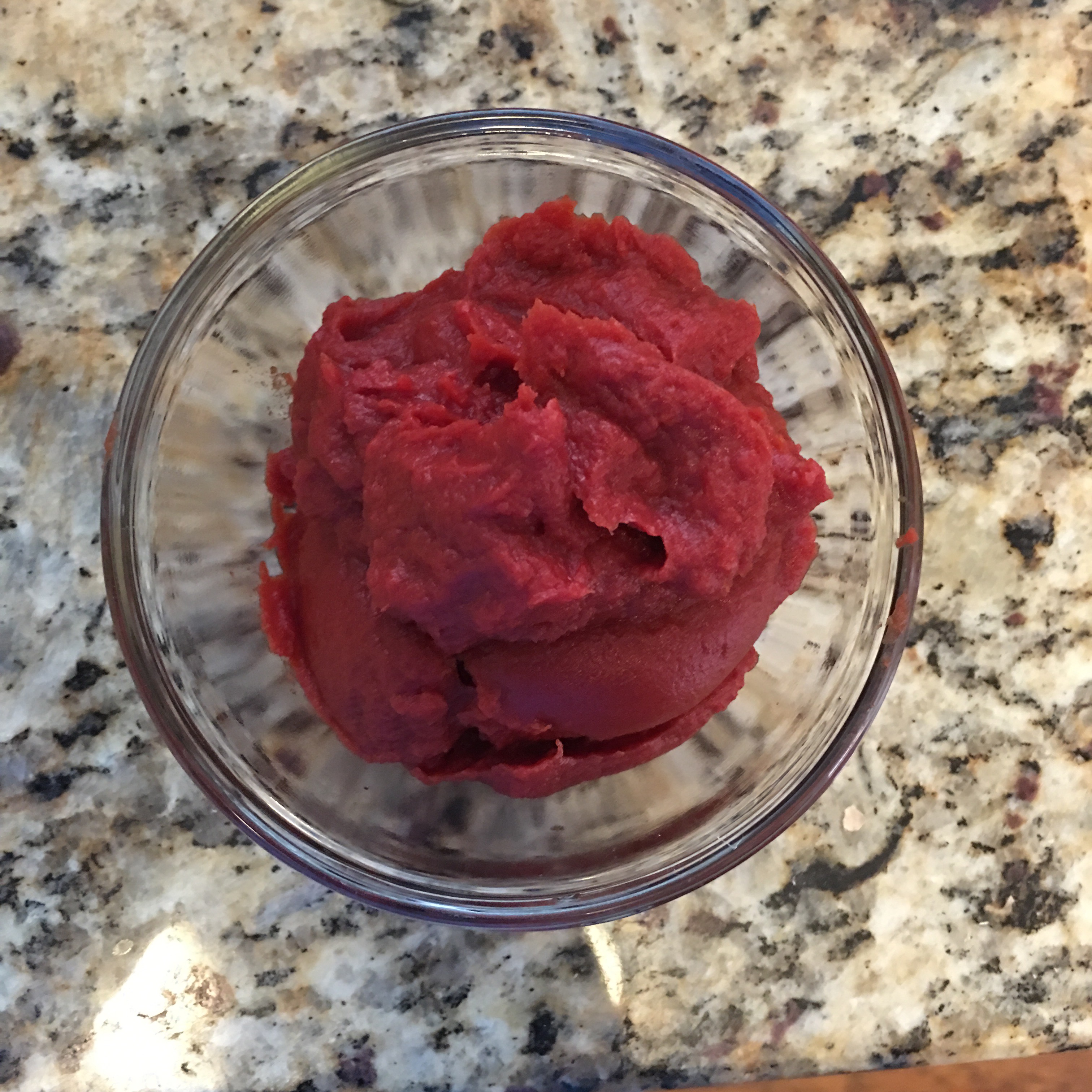 4. Add tomato paste and 1 cup water to fresh ingredients simmering.