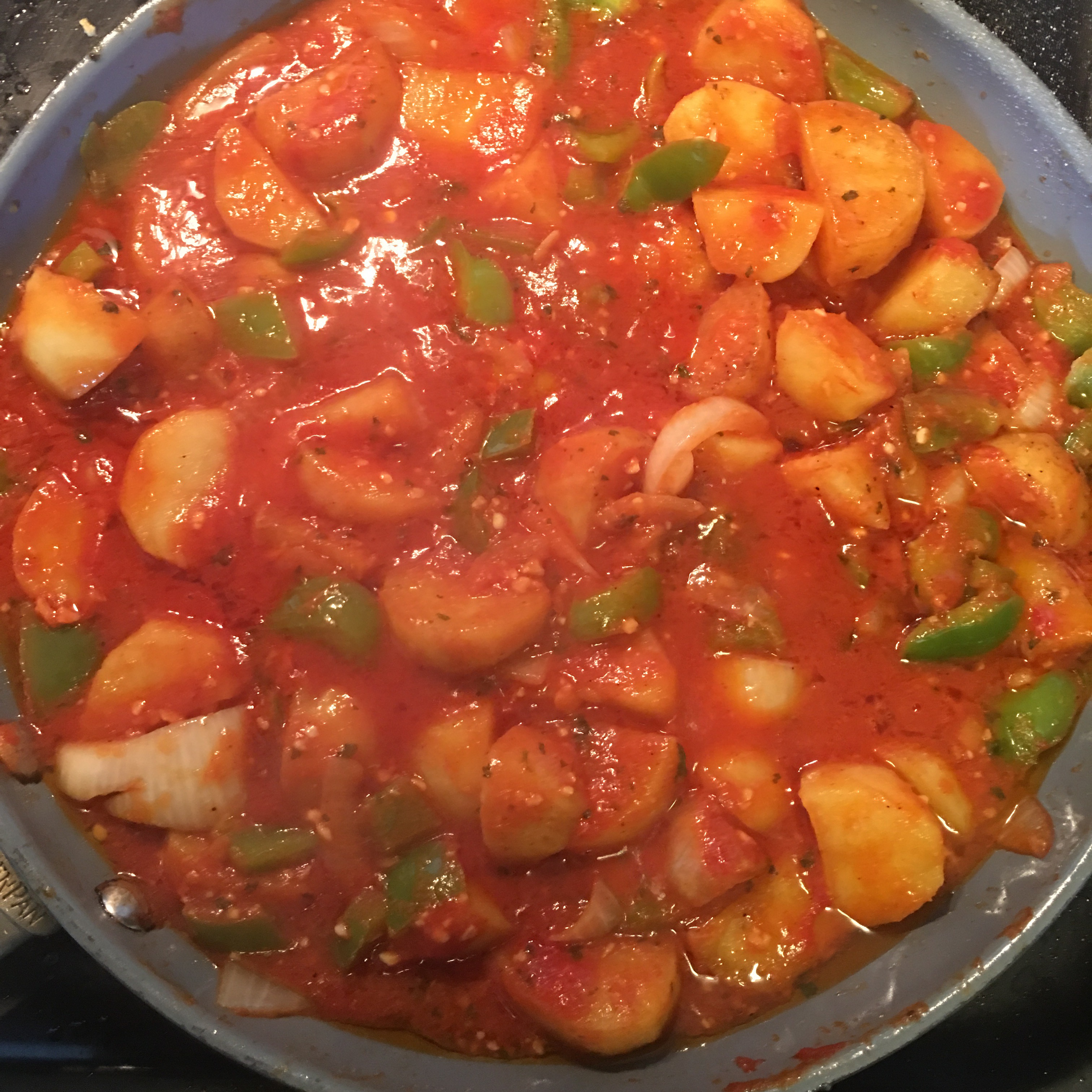 5. Add the fresh ingredients and tomato sauce to the potatoes and allow to low simmer for 10 minutes, uncovered. This is when to add dash of cumin, turmeric, and chili powder as well as the scotch bonnet hot pepper sauce.
