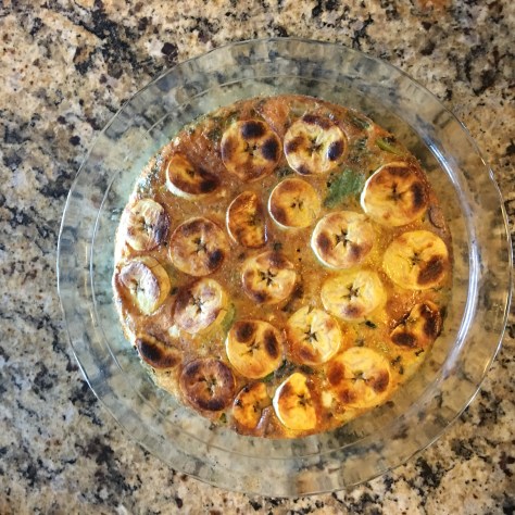 - Pour mixture into a 10-inch baking pan. Layer the baked plantains on top.