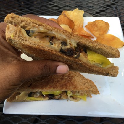 My first stop, August 22, 2016, was The Local Eatery & Pub. Here I tried the “Veggie Grill,” grilled whole wheat with pepper jack cheese, roasted garlic hummus, peppercinis, black olives and sauteed onions.