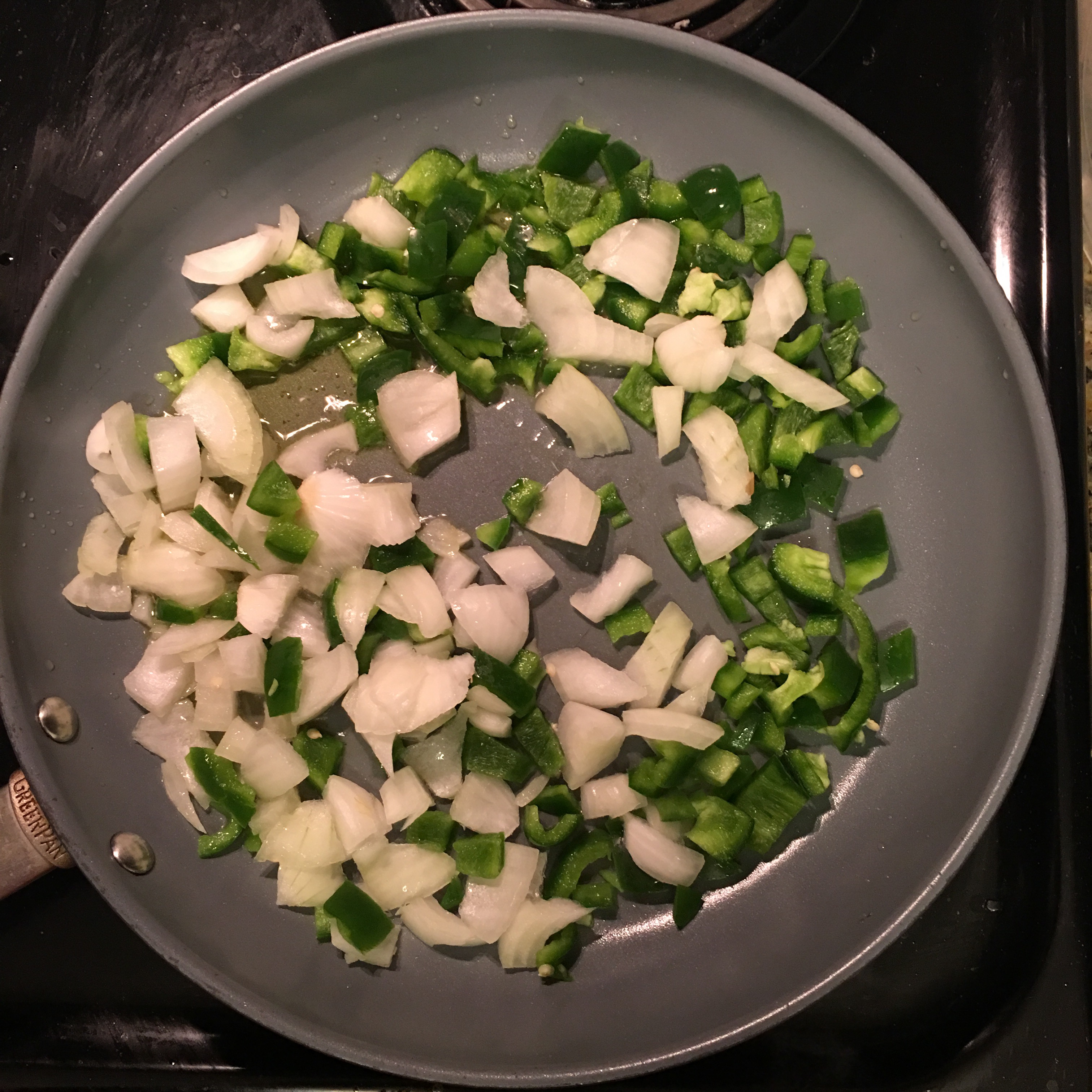 1. Heat oil in large saucepan. Add peppers and onions. Cook for 5-10 minutes. (Pic doesn’t show red pepper but it was added in too)