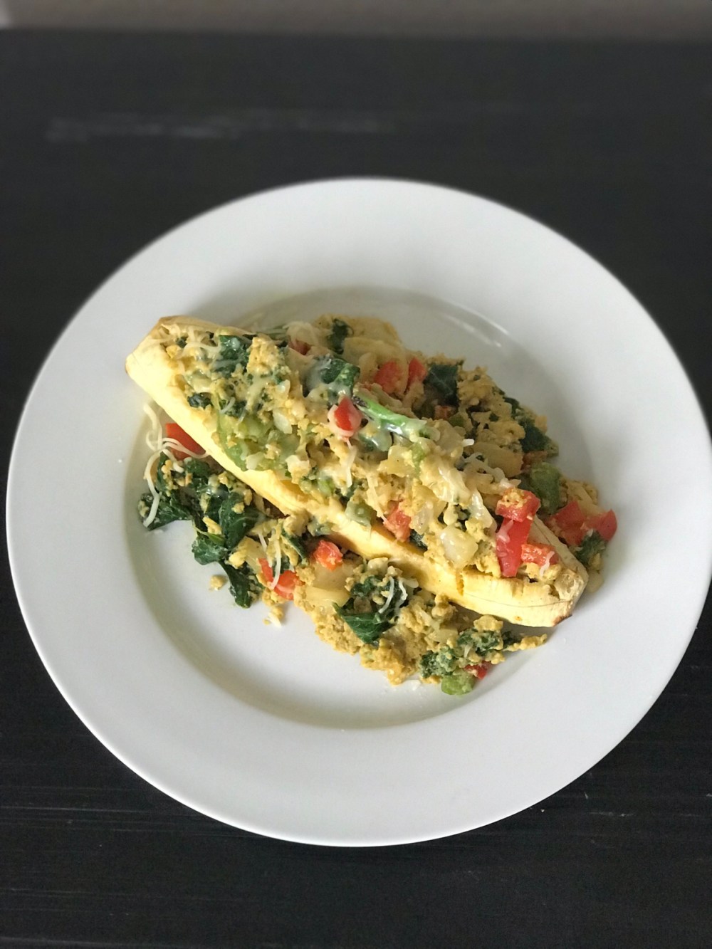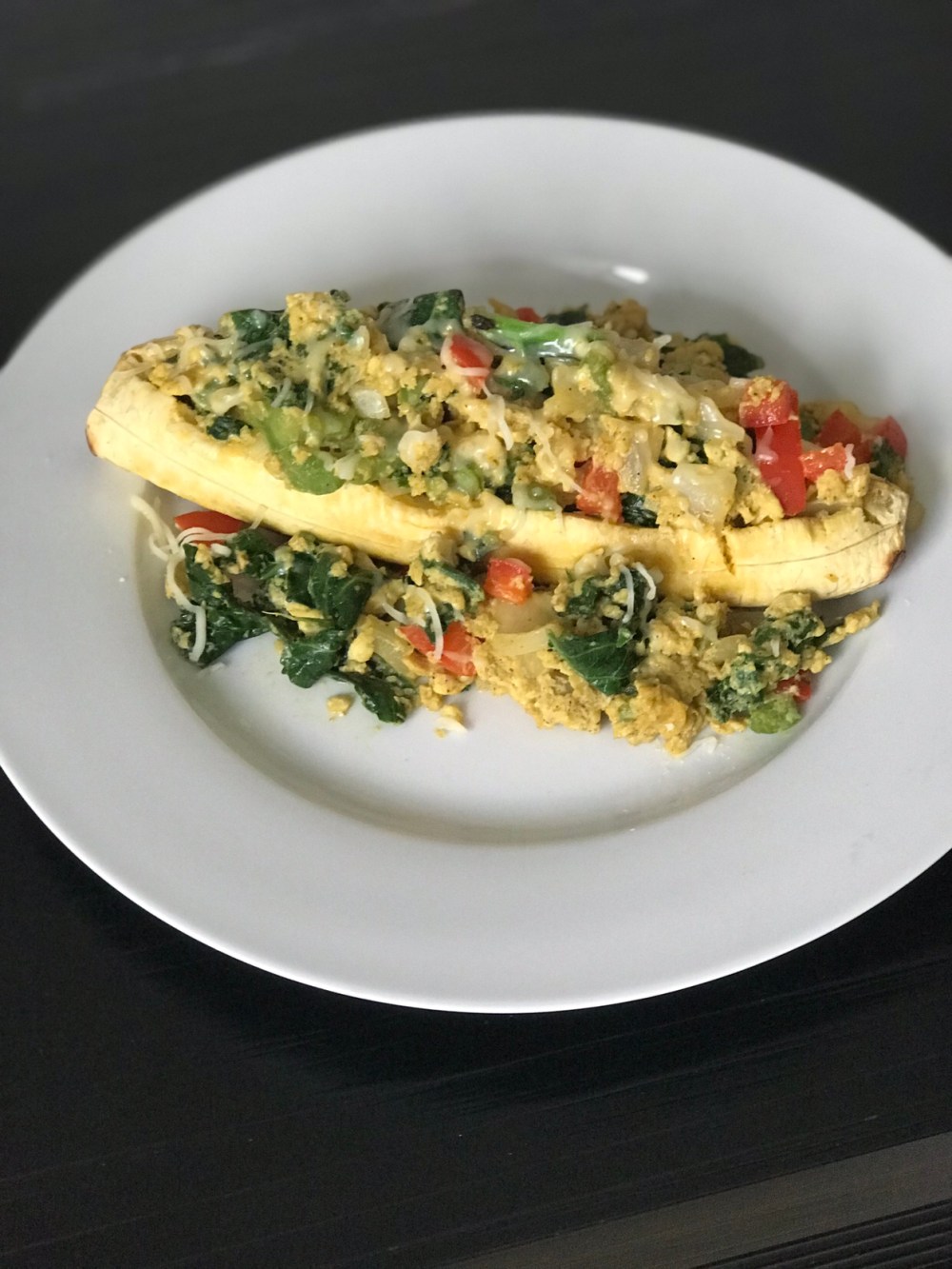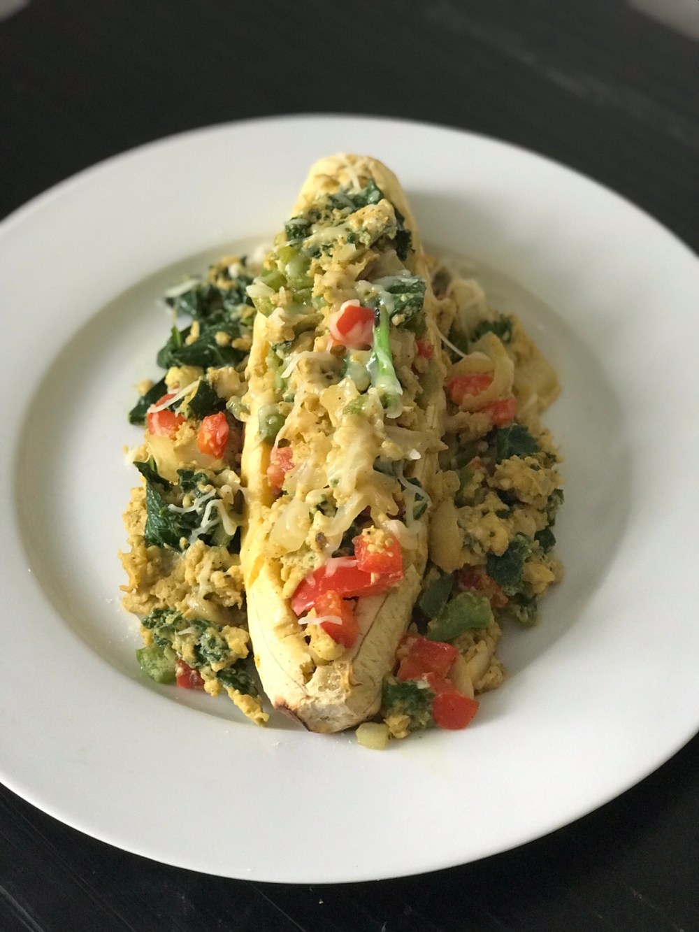 I love the weekends because I get to cook a full breakfast for my family. It’s raining today and I figured they’d enjoy being stuffed with a hefty, hearty stuffed Plantain. Not too worried about the carbs because I’m going to a hour long Zumba fitness class in about an hour, lol. Carbs are my friend because I exercise daily.